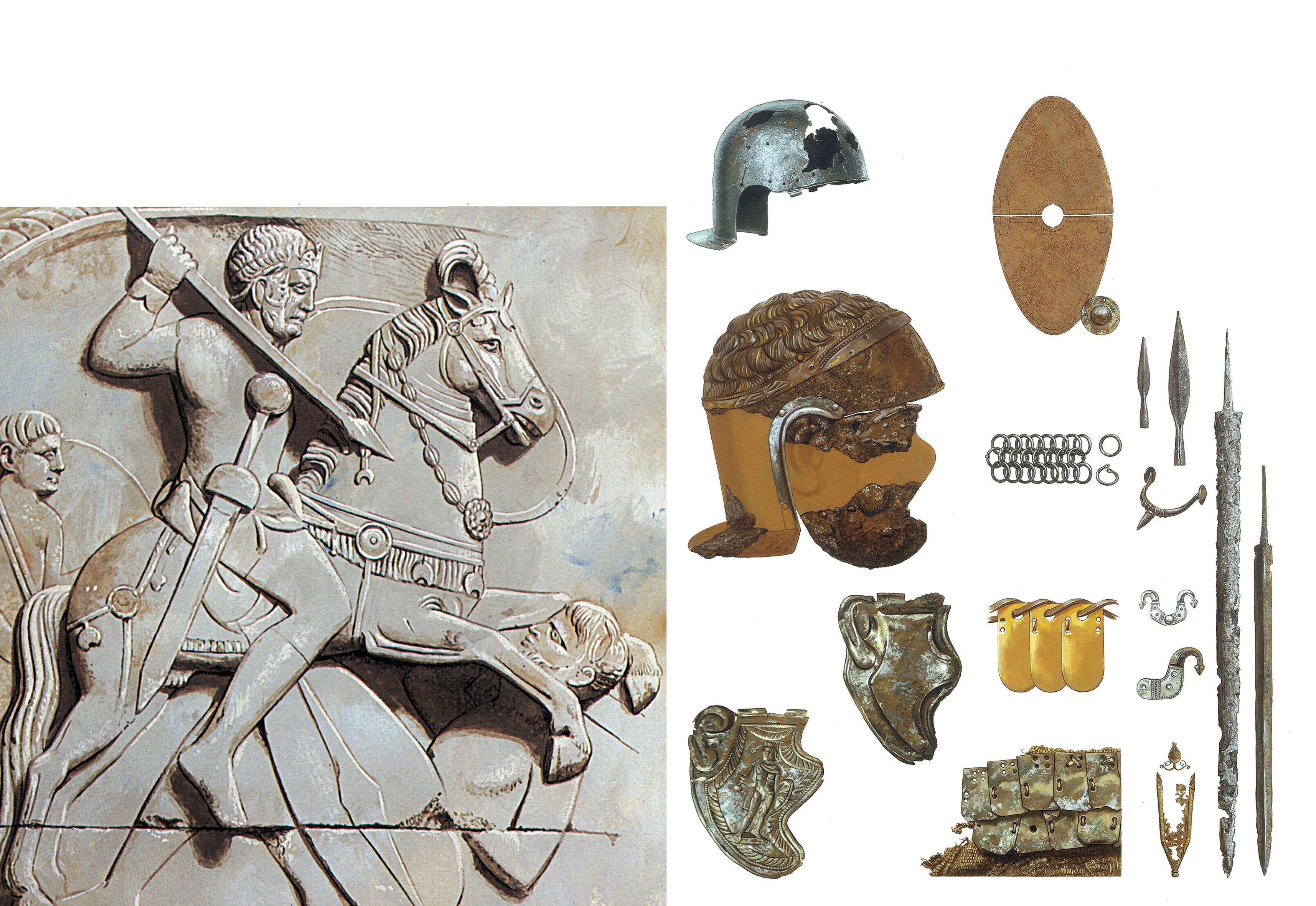 In questa immagine sono rappresentate alcune parti dell'equipaggiamento militare romano, rinvenute in Scozia, Olanda e Germania. Tra gli oggetti ritrovati vi sono elmi in ferro e bronzo, ripara-guance, maglie metalliche.