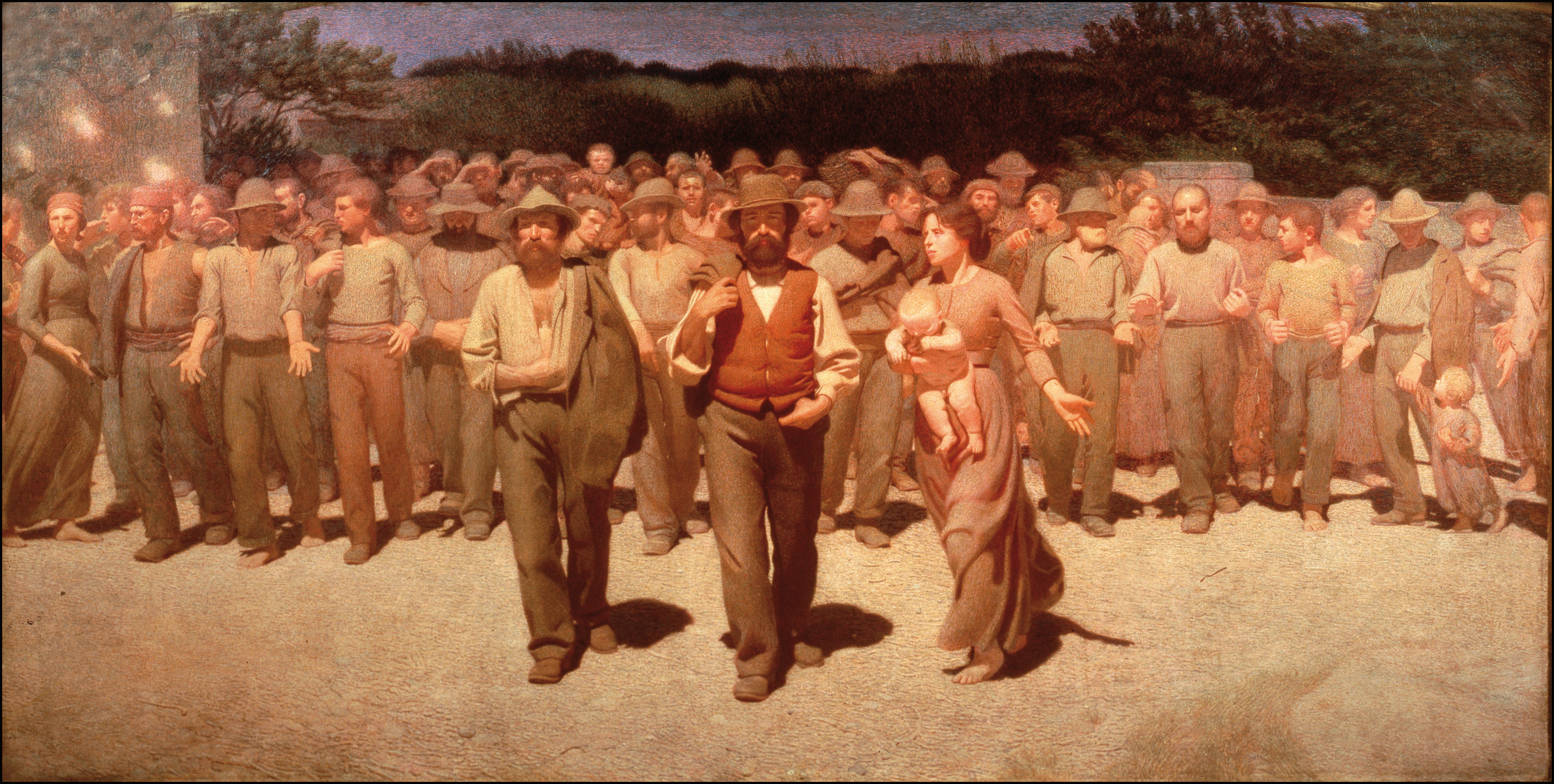 La schiera di lavoratori avanza a passo deciso verso la luce in primo piano, lasciandosi il tramonto alle spalle, evocando il «sole dell’avvenire» di giustizia verso il quale i lavoratori tendono.