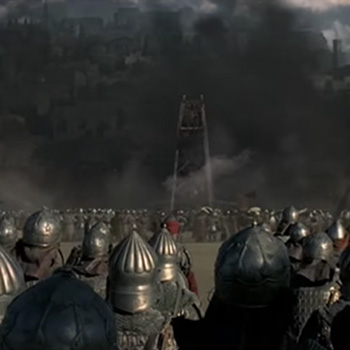 Essa raffigura la conquista di Gerusalemme da parte dei crociati guidati da Goffredo di Buglione nel 1099, dunque un secolo prima rispetto alle vicende del film. Per comprendere l’immagine bisogna ricordare che la scena della Passione di Gesù è stata inserita dal pittore per permettere di identificare la Città santa.