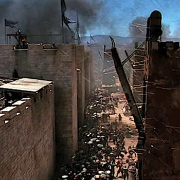 Nel rappresentare l’assedio di Gerusalemme effettuato da Salah al-Din nel 1187, Le crociate sembra ispirarsi alle pitture medievali, come questa miniatura anonima del XII secolo.