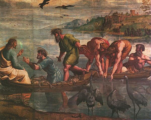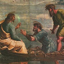Quando ebbe finito di parlare, disse a Simone: «Prendi il largo e gettate le vostre reti per la pesca». Simone rispose: «Maestro, abbiamo faticato tutta la notte e non abbiamo preso nulla; ma sulla tua parola getterò le reti». Fecero così e presero una quantità enorme di pesci e le loro reti quasi si rompevano. Allora fecero cenno ai compagni dell’altra barca, che venissero ad aiutarli. Essi vennero e riempirono tutte e due le barche fino a farle quasi affondare. Al veder questo, Simon Pietro si gettò alle ginocchia di Gesù, dicendo: «Signore, allontànati da me, perché sono un peccatore». Lo stupore infatti aveva invaso lui e tutti quelli che erano con lui, per la pesca che avevano fatto; così pure Giacomo e Giovanni, figli di Zebedeo, che erano soci di Simone. Gesù disse a Simone: «Non temere; d’ora in poi sarai pescatore di uomini». E tirate le barche a terra, lasciarono tutto e lo seguirono.