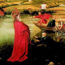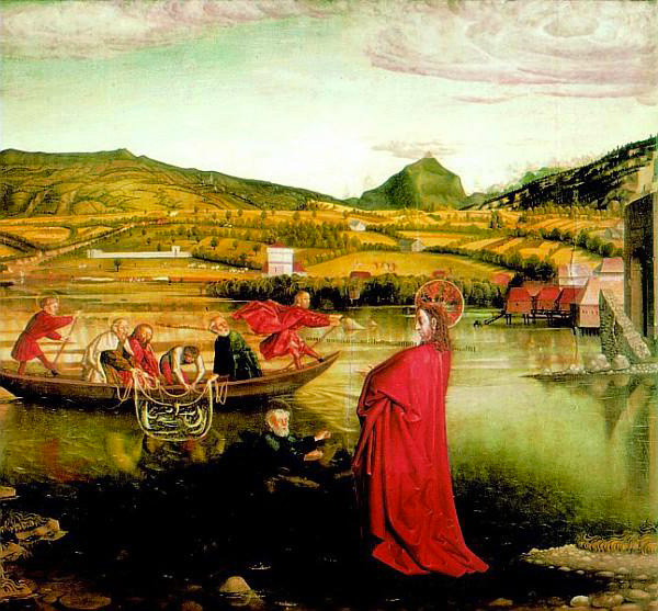 Pietro si lancia sulle acque del lago per raggiungere Gesù, ma a poco a poco comincia a inabissarsi. Gesù scivola sulle acque verso Pietro, che senza il suo aiuto annegherebbe. Mentre tutte le altre figure si riflettono nell’acqua, il mantello rosso di Gesù non si specchia nelle onde. In questo caso la fonte è il Vangelo di Matteo.