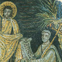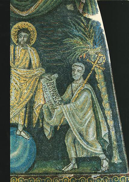 Collegata idealmente al tema della “Consegna delle Chiavi” è l’iconografia della Traditio legis, sviluppatasi sin dal IV secolo. Come Dio Padre aveva dato a Mosè i comandamenti, così Cristo, in piedi su un globo azzurro, simbolo del Creato, consegna a Pietro la nuova legge, un rotolo svolto sul quale si legge Dominus legem dat. L’apostolo porta una croce con il simbolo cristiano del Chi-rho, il cosiddetto monogramma di Cristo, formato dalle lettere XP, cioè le prime due lettere greche della parola ΧΡΙΣΤΟΣ – Christos – sovrapposte.