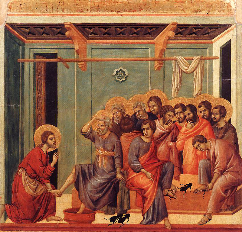 Gesù, con un asciugamano cinto in vita secondo la fonte evangelica di Giovanni, si accinge a lavare i piedi agli apostoli, ma Pietro non coglie subito il significato del gesto di Gesù e vorrebbe rifiutarsi di farsi servire da lui.
