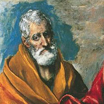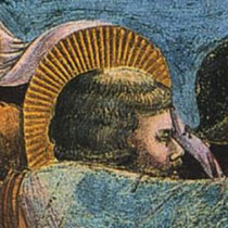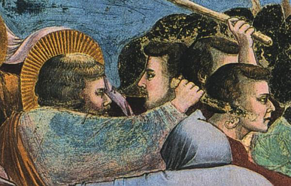 Nelle Storie di Cristo affrescate da Giotto nella cappella Scrovegni a Padova, Pietro viene presentato nei suoi caratteri più umani. Il particolare evidenzia il gesto violento dell’apostolo che, con un coltello, taglia un orecchio a Malco, allorché, nell’orto del Getsemani, Gesù viene circondato dagli inviati del Sinedrio per essere catturato.