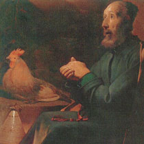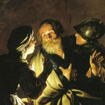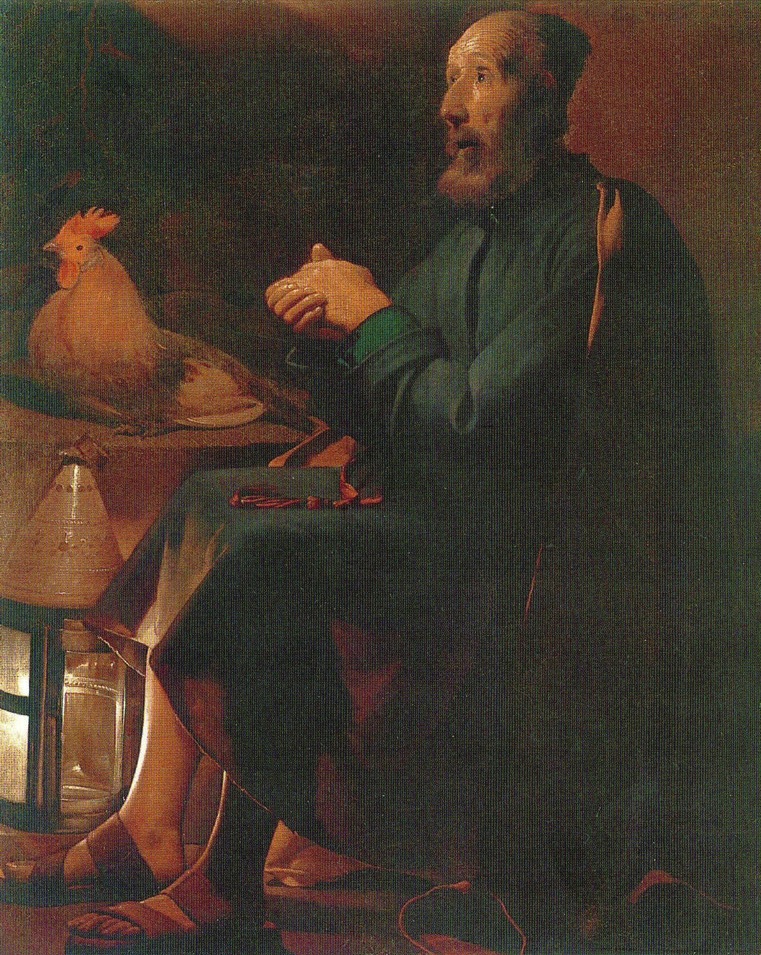 La pittura barocca si ispira spesso alle storie di Pietro, privilegiando l’indagine sui sentimenti e le emozioni. La scena raffigura il momento in cui l’apostolo, dopo avere rinnegato il Messia per tre volte di seguito, si ricorda, udendo cantare il gallo, di quello che Gesù gli aveva detto: