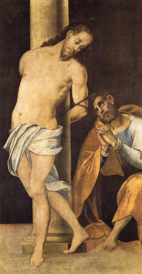 Questa originale iconografia, che non ha riscontro nei Vangeli, mostra Pietro in lacrime davanti a Cristo legato alla colonna. Ora, sappiamo che nessuno degli apostoli seguì Gesù durante la flagellazione, ed è come se l’artista avesse voluto conferire maggior risalto al pentimento di Pietro, dopo il triplice rinnegamento, mediante l’accostamento con uno dei simboli più pregnanti della Passione, la colonna della flagellazione.