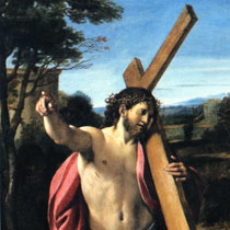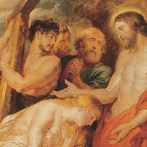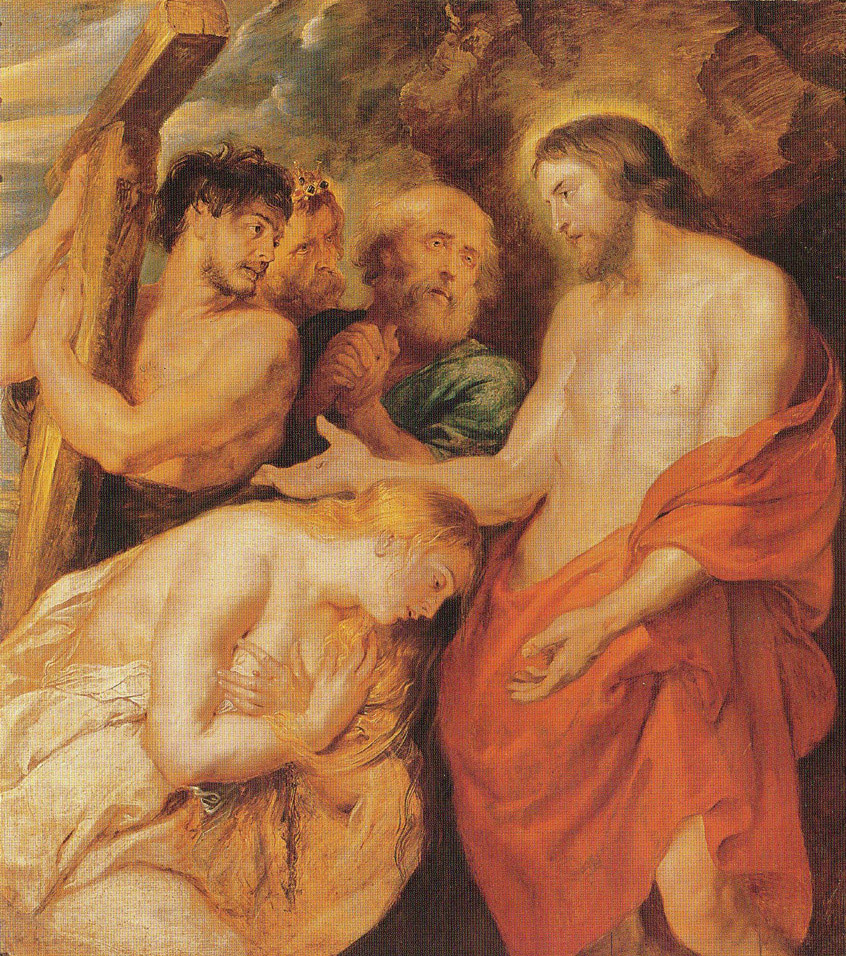 Si tratta di una iconografia piuttosto insolita, che raffigura Gesù con alcuni grandi “pentiti” della tradizione cristiana, che meritarono il perdono in virtù della loro sincera contrizione. Davanti al Cristo in piedi, nel tradizionale atteggiamento del Risorto, vediamo la Maddalena, il re David e il buon ladrone, uno dei malfattori suppliziati ai lati della croce, e, con le mani giunte, lo stesso Pietro, che aveva negato per ben tre volte di conoscere Gesù la sera del suo arresto.