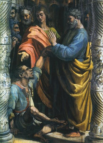 È Pietro, dopo la prima predicazione, a compiere il primo miracolo dopo la Risurrezione. Salendo al tempio con Giovanni, guarisce, nel nome di Gesù, uno storpio che chiedeva l’elemosina.