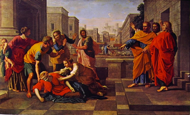 I coniugi Anania e Saffira caddero morti dopo avere mentito a Pietro per avarizia, affermando di avere dato in offerta agli apostoli l’intera somma ricavata dalla vendita delle proprie terre. Si noti come al centro della composizione, in secondo piano, vi sia una persona che dà l’elemosina a un mendicante, come a sottolineare la morale dell’episodio principale.