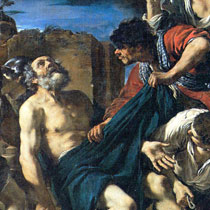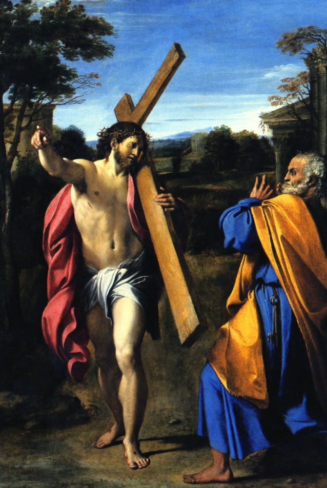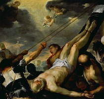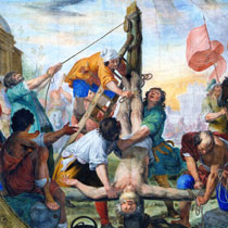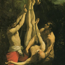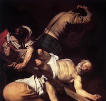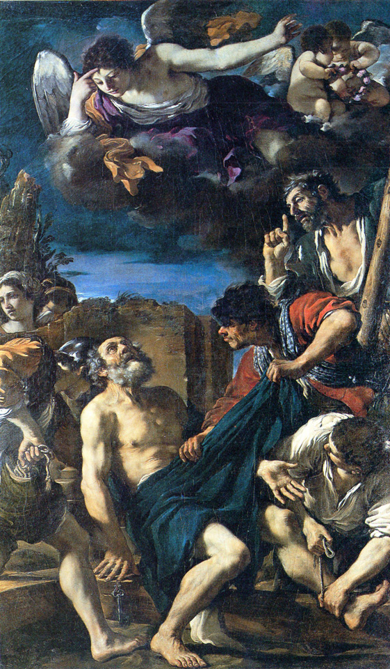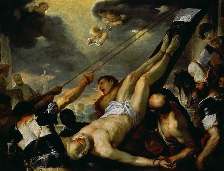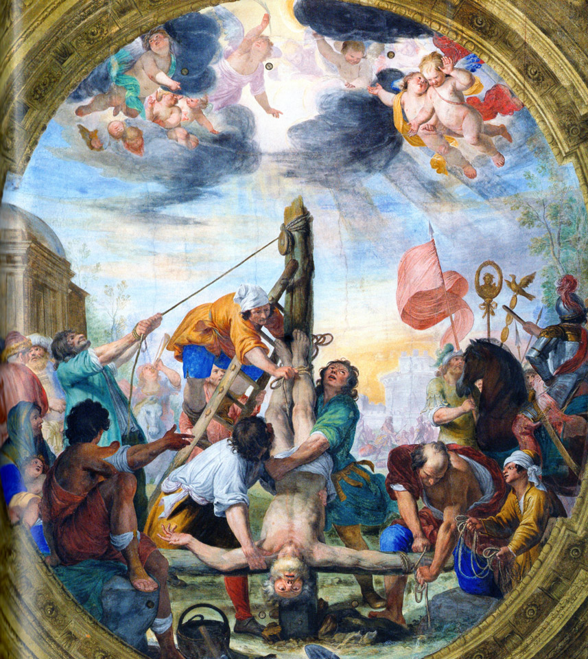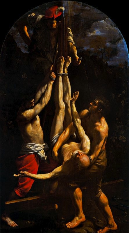 È possibile seguire, quasi minuto per minuto, le fasi del martirio di san Pietro, tanto è ricca l’iconografia che lo riguarda. Gli artisti hanno raffigurato ogni momento del supplizio, da quando viene spogliato per essere disteso sulla croce (Guercino), a quando i carnefici iniziano a sollevarla (Caravaggio); poi, vediamo l’apparato di funi e il grande sforzo necessario per erigere la croce (Luca Giordano), quindi l’apostolo legato alla croce ormai issata in verticale (Guido Reni), e infine la fase finale del supplizio, con l’apostolo a testa in giù che strabuzza gli occhi (Giovanni Battista Carlone). È il compimento della profezia di Gesù, che aveva predetto a Pietro “con quale morte egli avrebbe glorificato Dio” (Gv 21,19):