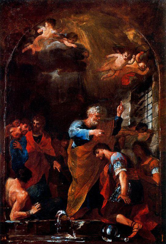 Pietro, dunque, fu arrestato in seguito alla persecuzione neroniana e rinchiuso, insieme a Paolo, nel Carcere Mamertino. I due carcerieri, destinati a diventare i santi Processo e Martiniano, vedendo i miracoli dei due apostoli, chiesero di essere battezzati. Pietro, percuotendo la roccia, ne fece scaturire dell’acqua e con essa battezzò Processo e Martiniano, i quali poi aprirono le porte del carcere invitando gli apostoli a fuggire. Subito scoperti, vennero torturati e infine giustiziati.