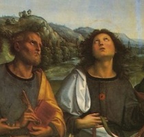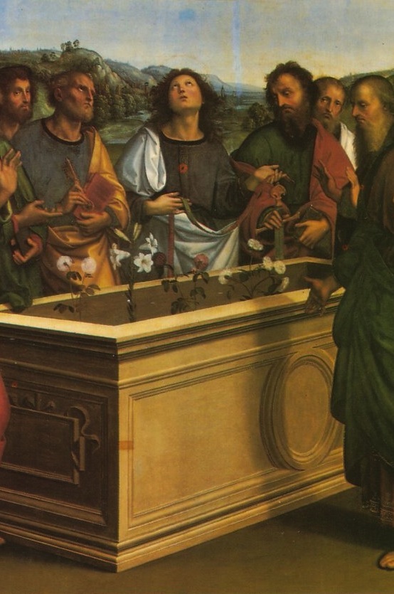 Gli apostoli radunati intorno al sepolcro vuoto di Maria per assistere alla sua incoronazione nell’alto dei cieli, recano ciascuno il proprio principale attributo iconografico: vediamo, a sinistra, san Pietro con le chiavi e, a destra, san Giacomo Maggiore con la spada; al centro, Raffaello raffigura san Tommaso con la Sacra Cintola, piovutagli miracolosamente dal cielo fra le mani.