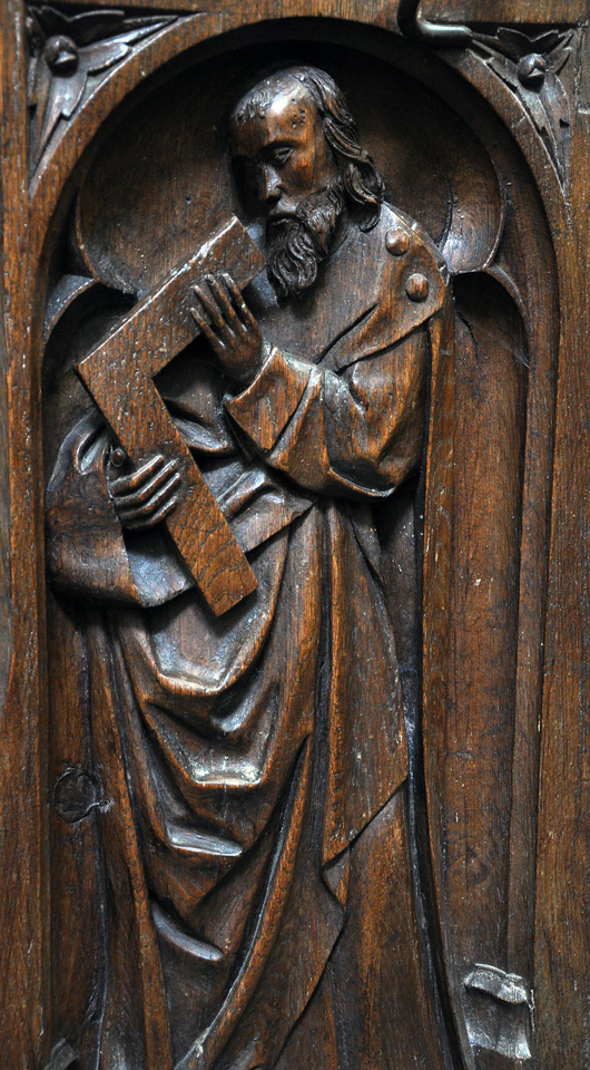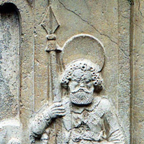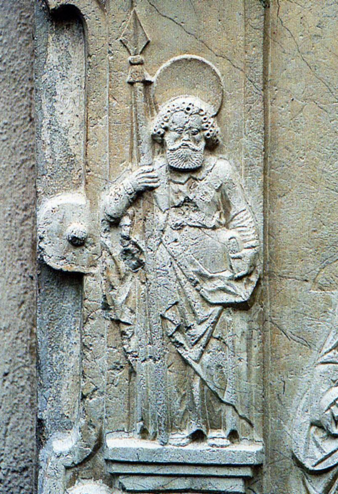 La lancia, nell’iconografia, rimanda sia allo strumento del suo martirio, sia a quella che trafisse il costato di Gesù che Tommaso pretese di “toccar con mano”.