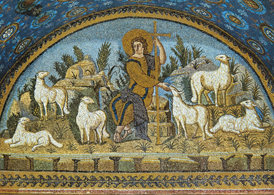 Cristo buon pastore (particolare), secondo quarto del V secolo, mosaico,