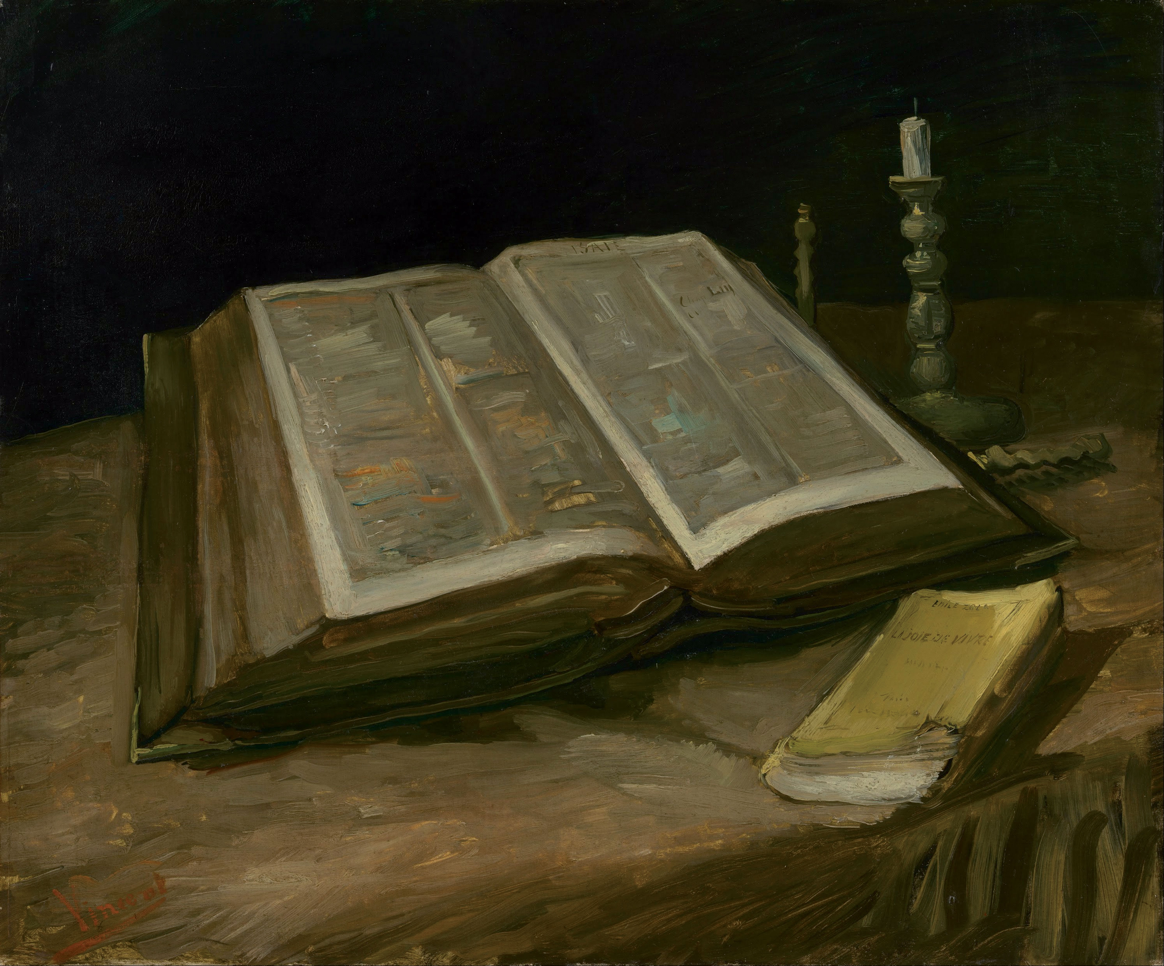 Il padre muore nel marzo 1885 e Vincent poco tempo dopo dipinge l’opera. Il quadro vuole rappresentare l’interiore riflessione del pittore sul rapporto tra Sacra Scrittura e vita, tra educazione ricevuta in famiglia e maturità di fede personale.