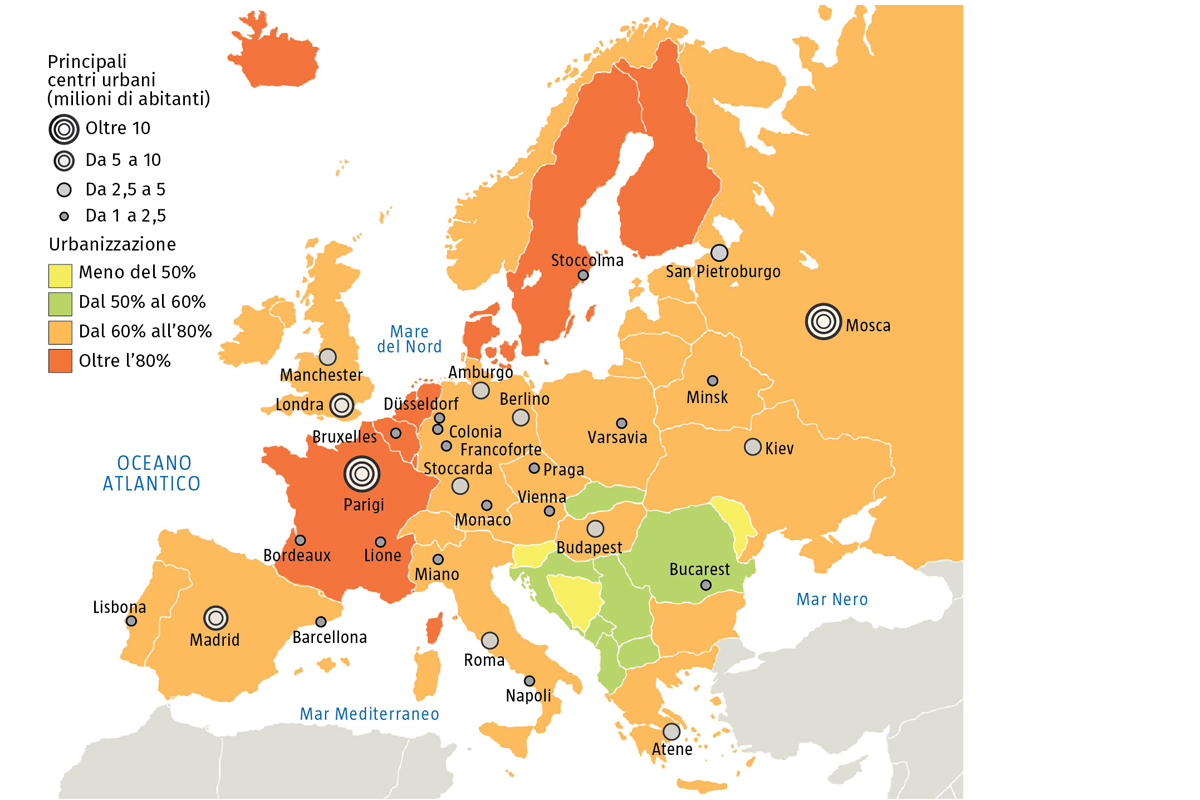 Il 74% degli europei vive in un’area urbana. A differenza di ciò che accade in altri continenti dove è massiccia la presenza di metropoli e megalopoli, però, l’Europa è caratterizzata da centri di medie dimensioni alternati a regioni urbane e aree metropolitane.