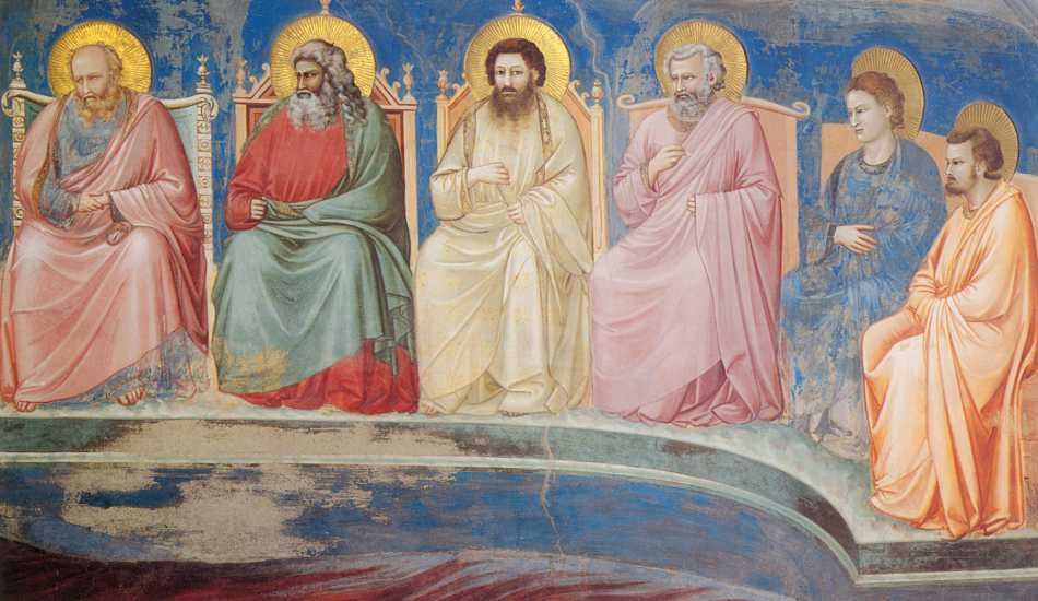 A destra e a sinistra di Cristo Giudice sono raffigurati gli Apostoli, suddivisi in due gruppi. Essi siedono su troni tutti diversi l’uno dall’altro, posti su una grande pedana curva che dà l’idea di profondità. Alla sinistra di Cristo (e quindi nella parte destra dell’affresco) si riconoscono, partendo dal trono più vicino al Giudice: Matteo, Andrea, Bartolomeo, Giacomo Minore, Giuda Taddeo, Mattia.
