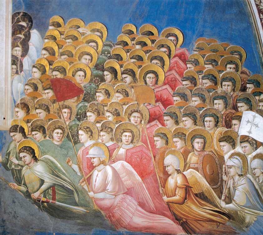 Sulla parete di fondo, a destra e a sinistra della finestra, si trovano due schiere di angeli. Si riconoscono diverse file di angeli guerrieri, come testimoniato dalle armature e dagli scudi tondi o ovali di colore verde a sinistra, esagonali decorati a motivi vegetali o animali, di colore rosso, a destra. In prima fila, in basso, quattro angeli reggono le aste con i vessilli.