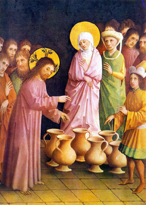 «Tre giorni dopo ci fu una festa di nozze in Cana di Galilea e c’era là la madre di Gesù. Fu invitato alle nozze anche Gesù con i suoi discepoli. Ed essendo venuto a mancare il vino, la madre di Gesù gli dice: “Non hanno più vino”. Le dice Gesù: “Che vuoi da me, o donna? Non è ancora venuta la mia ora”. Sua madre dice ai servi: “Fate quello che vi dirà”. C’erano là sei giare di pietra per le abluzioni dei Giudei, capaci da due a tre metrete ciascuna. Dice loro Gesù: “Riempite le giare di acqua”. Le riempirono fino all’orlo. Dice loro: “Ora attingete e portatene al direttore di mensa”. Essi ne portarono. Come il direttore di mensa ebbe gustata l’acqua divenuta vino (egli non sapeva donde veniva, mentre lo sapevano i servi che avevano attinto l’acqua), chiama lo sposo e gli dice: “Tutti presentano dapprima il vino buono e poi, quando si è brilli, quello scadente. Tu hai conservato il vino buono fino ad ora”. Questo inizio dei segni fece Gesù in Cana di Galilea e rivelò la sua gloria e i suoi discepoli credettero in lui.»