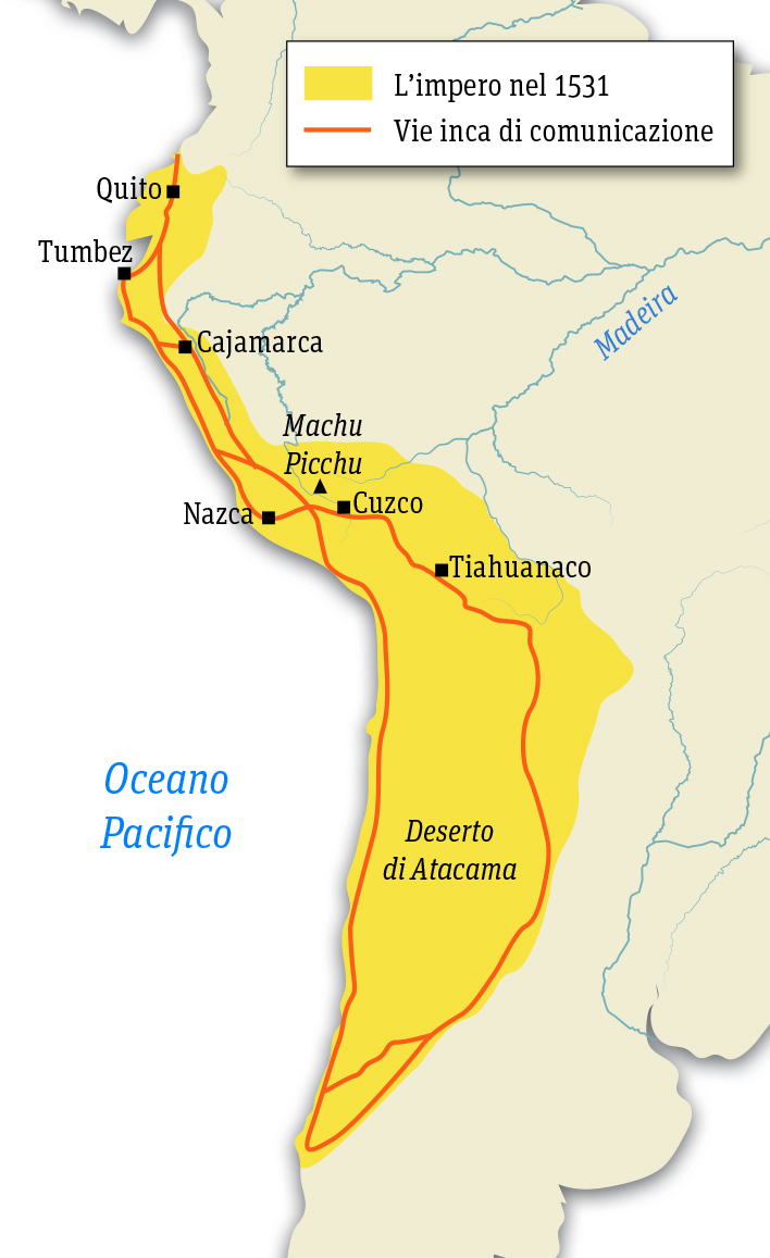 Dalla capitale gli Incas avevano progressivamente esteso il loro dominio in tutte le direzioni: all’arrivo degli Spagnoli il loro impero era limitato a Occidente dal Pacifico, a Oriente dalle Ande; a Settentrione si spingeva oltre Quito (nell’odierno Ecuador) e a Sud fino al Río Maule, oltre l’odierna Santiago.