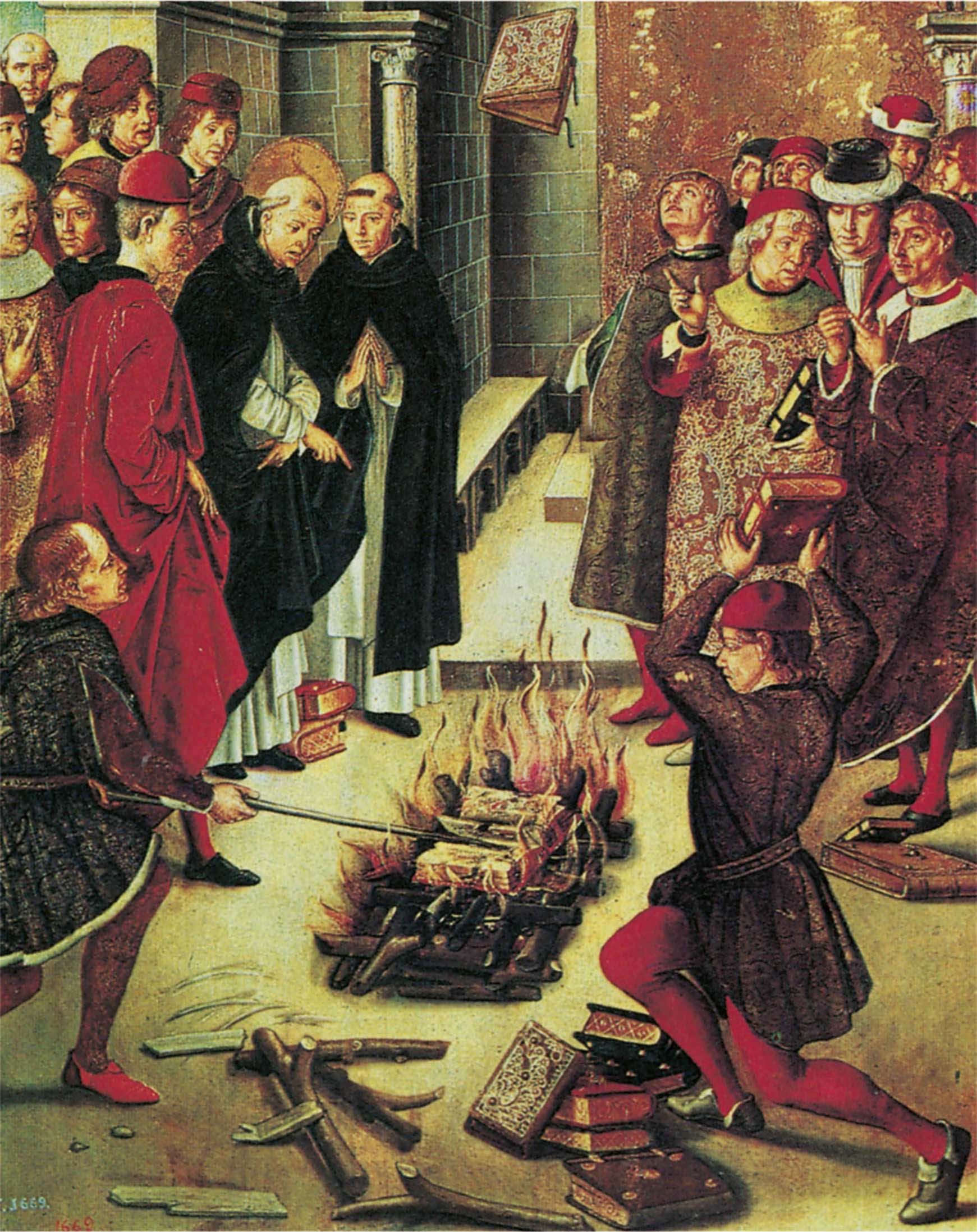 Il rogo dei libri è qui presieduto da san Domenico, che fa con la mano il cenno di condanna. All’ordine dei domenicani dal 1235 era stato affidato dal papa il compito di affiancare i vescovi nella conduzione dei processi inquisitori.