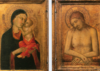 Con la Madonna col Bambino a sinistra e Cristo come “Uomo dei dolori”, tipologia devozionale assai diffusa che raffigura Gesù morto in posizione eretta, visibile dalla vita in su fuori dal sepolcro, con gli occhi chiusi e le braccia incrociate sul ventre, il Dittico del XIV secolo sposa in un’unica immagine i due estremi dell’esistenza terrena di Gesù, proprio come la Natività di Lorenzo Lotto che abbiamo esaminato. A proposito della compresenza, sinora considerata a livello iconografico, della nascita e della morte di Gesù, ricordiamo che questa è presente anche in ambito letterario. Per esempio, esiste una versione dello Stabat Mater (letteralmente, «Stava la madre», inno sulle sofferenze di Maria durante la Passione attribuito a Jacopone da Todi, sec. XIII) che i fedeli cantavano a Natale anziché nella Settimana Santa allo scopo di esaltare la gioia per la nascita di Gesù e al tempo stesso il dolore per la sua morte. Lo Stabat Mater di Pasqua iniziava con le parole «La Madre addolorata stava / in lacrime presso la Croce / su cui pendeva il Figlio», mentre quello di Natale iniziava così: «La madre, splendida, stava / presso la paglia, piena di gioia / ove il piccolo giaceva».
